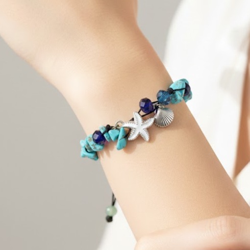دستبند اقیانوسی با تم آبی و آویز ستاره دریایی با جنس پایه نخی و مهره های با کیفیت