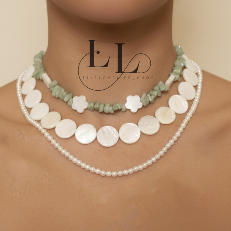 ست گردنبند لایهای سهتایی ما، راهحل نهایی برای داشتن یک استایل شیک و چندلایه بدون زحمت است. این گردنبند مهرهای پرطرفدار، با ترکیب رنگهای سبز پاستلی و صدفی ، کاملاً مناسب پوستهای برنزه و استایلهای شیک است.